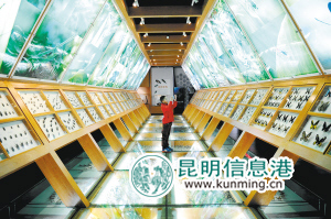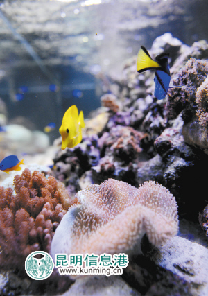 走进昆明动物博物馆,首先映入眼帘的是一个在彩灯照射下的鱼缸。这个水族箱里收集的珊瑚种类超过30种。目前国内缺乏超大型的活体珊瑚系统,而馆内水族箱已引入数十种海洋生物,从珊瑚、鱼类、细菌、藻类等形成了完整的食物链,在人工状态下创造出一个有机循环系统,用生物的办法来保证系统的运转。
