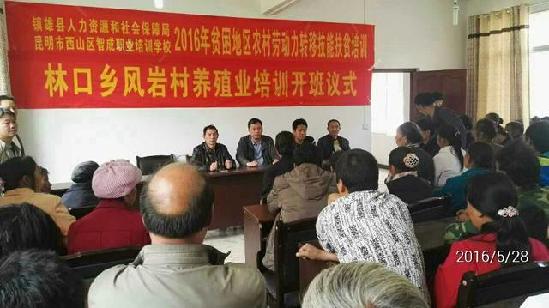 镇雄县人社局邀请昆明市西山区智成职业培训学校,5月24日在镇雄县林口乡风岩村举行养殖技术培训开班仪式,启动该村养殖技术培训工作。