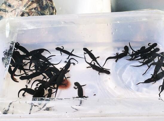 记者又来到售卖水生动物的区域,看到商铺前用白色盒子放着一些两栖爬行动物,它们有的全身呈黑色,有的身上色斑艳丽。“这是疣螈,35元一只,能吃蚊子,好养得很,昨天还有人来买走好几只。”商铺老板热情推销,“还有东方蝾螈,看着像娃娃鱼,但体型小,也好养。”