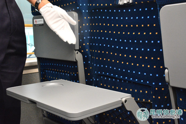 在“和谐号”上,每位乘客都拥有自己小桌子和置物袋,细微之处的体验可媲美乘坐飞机。