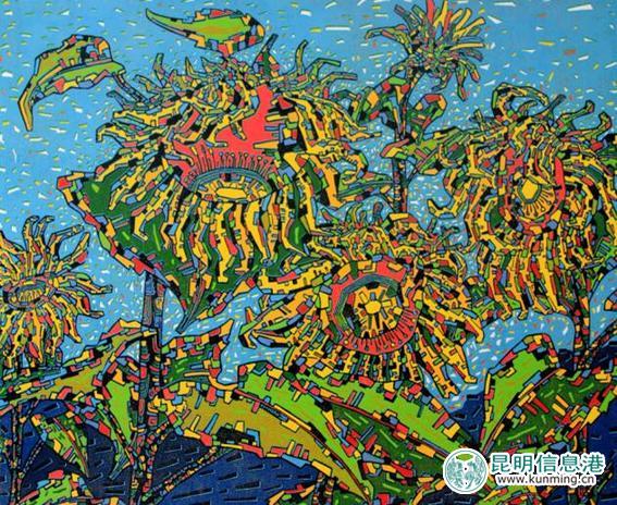 “可以叫我晓明。”他不好意的笑,有些腼腆。第一次见施晓明的作品是在微风画廊,一幅《向日葵——舞》让人眼前一亮。带着音乐般跳动节奏的色块,把印象派的浪漫情怀发挥得淋漓尽致。有人评价他是最浪漫的刻印高手。眼前的施晓明穿着一件蓝白相间的T恤,整个人显得质朴、简单。没有夸张的色调,没有前卫的造型,活脱脱一个邻家男孩的形象。他的作品风格独特,在众多画作中一眼便可认出。与外表不同,他对待艺术的态度非常严谨,在解释绘画语言时纠正了关于他的画作是几何形状拼接的说法,他说:“应该是版画语言,点线面的结合加上刀法组织,刻板上就会有不同的印迹。”