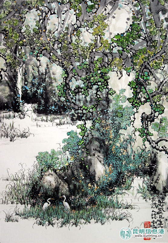 赵云昆作品与常见的山水、花鸟画有明显区别,不光是传统的折枝花卉,更多的是表现大自然的和谐,以及那种特有的时代气息、时代特征与时代精神。而且他笔下描绘的植物、以及各种花卉,除了是向观者直观传递出物象万盛生命力的同时,还向人们展现出一片生机勃勃、幽情壮彩的神秘景象,不仅画面情调烂漫,而且反映出画家多年来在学习、继承优秀传统文化之外,勤于观察、勤于思考与勤于研究,终以“万物为师,造化于心”形成画家独特的艺术审美理念、独到创作思想与特有的绘画语言、唯美表现形式。