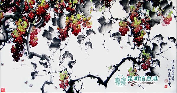 葡萄、雪梅、版纳风情、牡丹,都是赵云昆绘画作品中常见的题材。赵云昆创作这些艺术作品,无不体现着他扎实的艺术功底和绝佳的绘画技巧。信守着笔墨的底线,在很好的掌握点、线、面的应用的基础上充分利用的西画技法,强调光影的效果,更好的增强,突显了色彩透视。迎面处的亮,背面处的暗,可以说,在色彩处理上十分的小心与得当。他注重传统技法点线面的应用,书法用笔与随类施彩,落笔胆魄、骨力有劲。虚与实、柔与刚、阳与阴、明与暗的结合,都充分掌握自然中的光与影的关系。