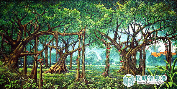 赵云昆为创作《有一个美丽的地方》(西双版纳风情系列)曾十多次深入雨林、澜沧江边、傣家村落等地进行实地写生,他深深迷恋着这片美丽神秘的土地(西双版纳现也是他的第二故乡)。在欣赏他创作的一幅幅描绘美丽西双版纳热带雨林美若仙境的画面时,扑面而来的是那芬芳花香与幽深静谧的林荫,是飞瀑和弦与泉水幽旋,此时我们似乎早也是置身其间!画面中还不时传来孔雀在鸣唱、那吉象踏歌而来、白鹭在双双低语……所有一切是那样的美妙、唯美、和谐,让人向往,梦一样的美,情一样的深,这如情似梦画面就是赵云昆笔下西双版纳那美丽的天和秘林。