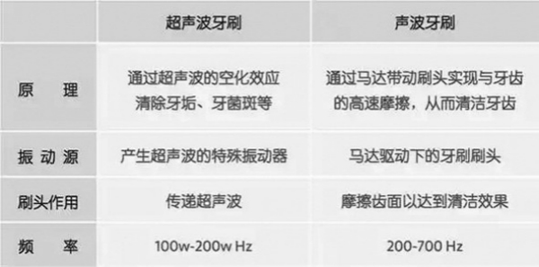 超声波牙刷便是将超声洗牙的原理应用在了牙刷中,其内部有可产生超声波的振动器。牙刷工作时利用超声波在牙周的空化效应来清除牙菌斑和不洁物。而传统的两类电动牙刷都是靠电机带动刷头做持续的高频机械运动,进而通过刷毛与牙齿的接触和摩擦来清洁牙齿的。