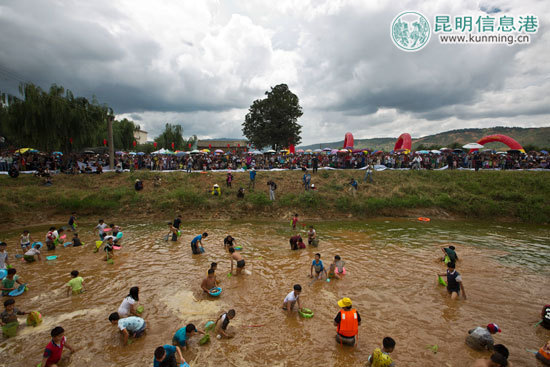 当天,来自四面八方的亲朋好友汇集旧寨村,共同分享“渔人节”的快乐。活动最吸引眼球的是“摸鱼比赛”,成千上万的人集聚到鱼塘边观看比赛,场面热闹壮观。主持人宣布比赛开始,上百名“渔人”鱼贯入水塘,开始摸鱼,有的用网兜、有的用小盆、有的用编织袋,可谓八仙过海各显神通。