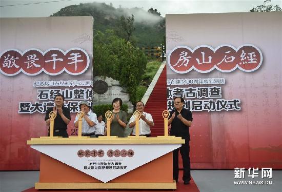 8月7日,“敬畏千年 房山石经”——石经山整体考古调查暨大遗址保护规划启动仪式,在北京房山云居寺石经山脚下举行。石经山是北京房山石经刊刻起源之地、佛舍利出土之处,保存着4196块国宝石经,有以雷音洞、金仙公主塔等为代表的众多历史遗迹,具有极高的学术、文化、历史价值。(记者罗晓光/摄)