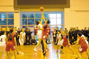 18:30,学校女子篮球与西南林业大学的比赛在警体馆激烈进行,运动员们身形矫健灵活,在队友的掩护与挡拆下,一次次突入内线,成功扣篮,而双方比分也是紧咬不放。