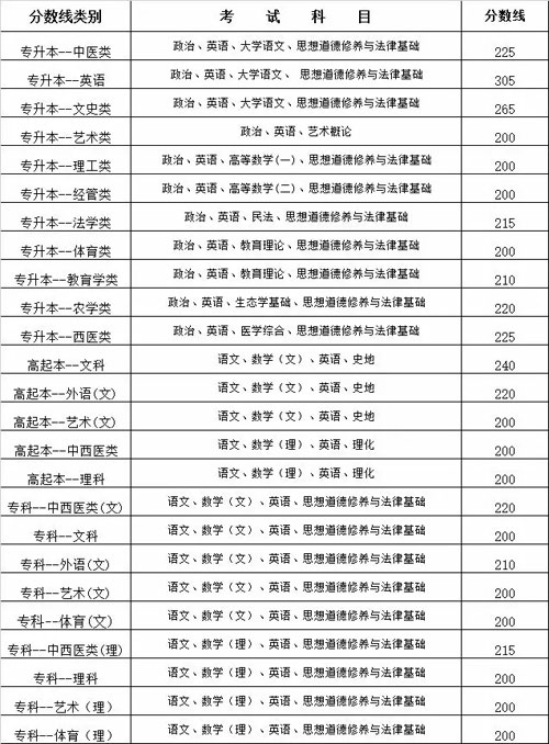 专升本中,英语类分数线最高,为305分;高起本中,文科分数线最高,为240分;专科中,中西医类分数线最高,文科为220分,理科为215分。此外,还要求外语专业的外语单科成绩本科必须达到60分,专科必须达到40分;成人中专实行免试录取。
