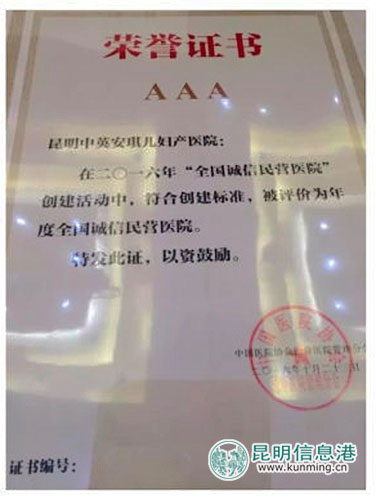 2015年8月,云南省医院协会首次启动了“云南省诚信示范民营医院”评选活动。经过一年的评审,昆明中英安琪儿妇产医院通过专家评审、第三方社会评价、现场抽查等多项程序的评审后,从云南89所民营医院中脱颖而出,以总评分排名第一的成绩获得“云南省诚信示范民营医院”称号。首批获评的22所医院代表云南,参加由中国医院协会开展的“全国诚信民营医院”创建活动。经过层层评审,昆明中英安琪儿妇产医院最终获得“2016全国诚信民营医院”称号,为推动我省民营医院依法执业、规范管理、诚信经营,提高民营医院的社会信誉起到积极的促进作用。