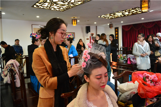“一枝桃花满庭春,千张笑颜玉泉美”,经过激烈角逐最终进入复赛的10名彩妆师,通过灵动不羁的线条符号、精致别样的造型搭配,描绘了或性感、或玩趣、或调皮的桃花妆容。正在对作品进行最后点缀的选手董佳丽说:“全是亲手的做的,包括发饰上的、衣服上的桃花都是从桃花枝上一个个摘下来,再用线串起来,再用珍珠还有小珠子等等的饰品做成的。”