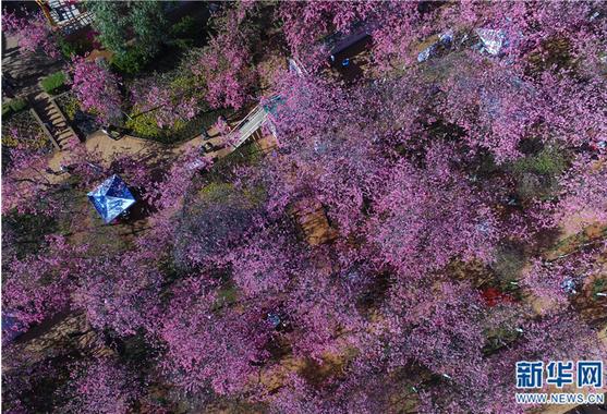 航拍昆明圆通山樱花潮 灿若云霞春色如画