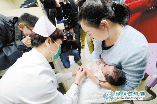 儿童疫苗“大家庭”又迎来一新成员。历时3个多月后,昨日,13价肺炎球菌多糖结合疫苗中国“第一针”新闻发布会在昆明等4个城市同时进行。据了解,该疫苗为二类疫苗,可以帮助6周龄至15月龄婴幼儿远离疫苗血清型肺炎球菌导致的侵袭疾病。作为云南首家“尝鲜”的医院,昆明市妇幼保健院即日起可为6周龄至15月龄的婴幼儿接种。