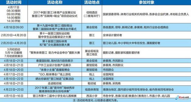 为充分发挥创新对企业转型升级的引领作用,本届博览会将举办多场专业化论坛及发布会,邀请国家工信部、科技部、质检总局相关领导及相关院士、专家、学者,就如何推动传统鞋(体)产业转型升级等进行深入研讨。届时还将举办2017中国(晋江)体育产业发展论坛暨晋江市“互联网+鞋业”项目启动仪式、福建省制鞋产业创新技术联盟揭牌仪式和制鞋标委会鞋底工作组授牌仪式等活动,促进晋江传统行业的协同发展和企业的转型升级。