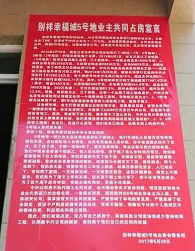 至于强行占房的缘由,在别样幸福城5号地业委会筹备组在发布的占房通知中给出了答案。《通知》表示:“外界疯传,开发商拖欠建筑商工程款,事实是,开发商各标段平均已经多支付2.8%的进度款。”“中兴拒不执行合同进度,坚持绑架5号地业主,要挟晓安公司先付完1、2、3、5号地所有工程全款才完工交房。至此,谈判已经完全破裂。”“谈判破裂后,中兴为了达到继续长期控制5号地的目的,防止业主占房,在向法院提起诉讼,从而实现其冻结工程的目的。”所以,业主已经退无可退,决定先占房再想办法完成剩余工程。