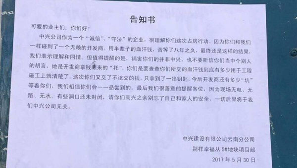 针对部分业主强行占房行动,建设方中兴公司在告知书中称:“中兴公司作为一个诚信、守法的企业,十分理解业主的占房行动。因为业主和中兴公司一样遇到了一个无赖的开发商。同时中兴公司提醒业主,祸害业主的并非中兴公司,希望业主查查交的钱有多少用于工程上便可知。最后,中兴公司表示,因为现场无电、无路、无水、有些洞口还未封闭,请业主注意自己和家人的安全,一切后果将与中兴公司无关。”