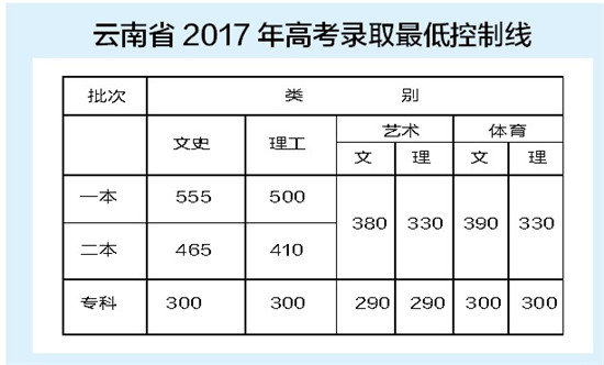 昆明信息港讯(都市时报 记者邹佳琪) 昨日,云南省2017年高考录取最低控制线出炉,根据云南省招生考试院公布的最低录取控制线,今年云南省本科第一批次文史类最低录取控制分数线为555分,理工类最低录取控制分数线为500分。本科第二批次,文史类465分,理工类410分,艺术(文)380分;艺术(理)330分,体育(文)390分,体育(理)330分。高职专科批次,文史类300分,理工类300分,艺术(文)290分;艺术(理)290分,体育(文)300分;体育(理)300分。