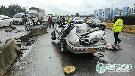 昆明信息港讯(都市时报 记者黄朝红) 昨天下午5点10分左右,一辆宜良万能驾校的教练车在刚过小喜村收费站前方2公里左右路段处撞上隔离墩,造成车辆仰翻在隔离墩上,车上1人当场死亡,1人重伤,3人轻伤。因隔离墩被撞开,随后又有1辆小货车和1辆微型车撞上去,造成现场堵车1个多小时。