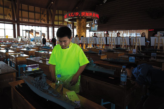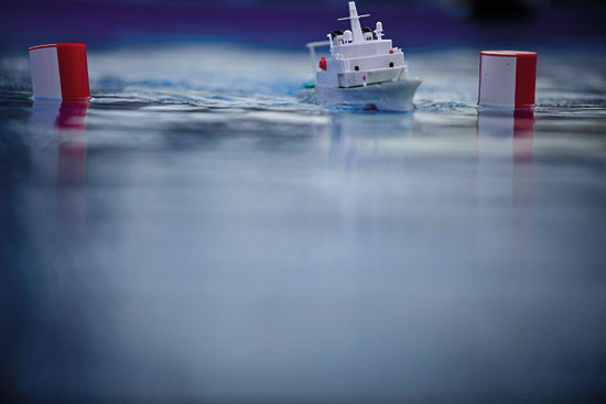 由2个6×10米的蓝色模型搭成的水池正迎来他们的小选手。将一艘按照比例缩小的舰艇放在水池中央,通过操控,选手们要让这艘船顺利完成绕桩、倒行和进港等规定动作,没有被扣分且用时最短的选手将获得冠军。在这个赛场,或许因为参赛选手年纪都不大,每当一个选手完成比赛,周围的家长都会给予热烈的掌声。不少围观的孩子也表示,想要亲自尝试一下。