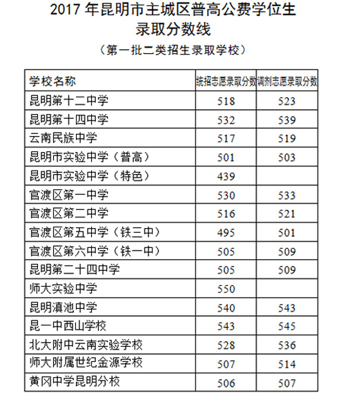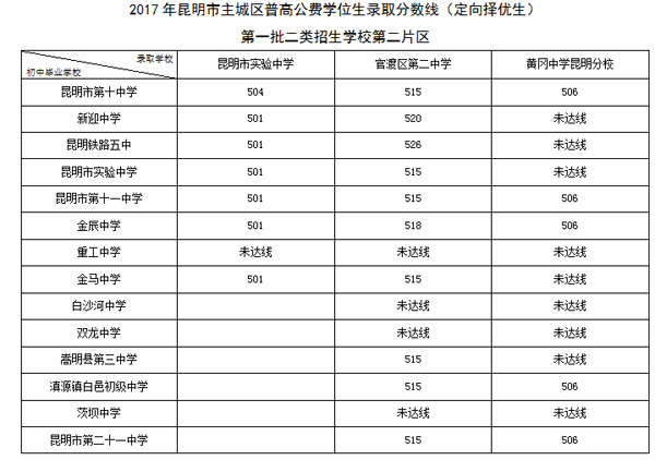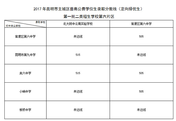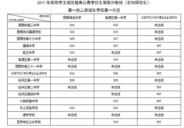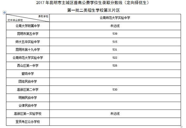 当日,还公布了2017年昆明市主城区普高公费学位生录取分数线(定向择优生)。具体如下: