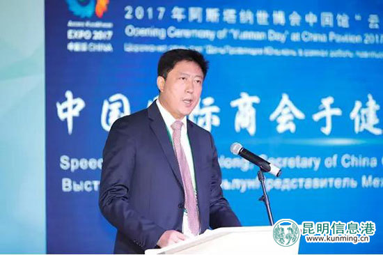 于健龙秘书长在开场致辞中表示,云南省是中国西南地区的重要省份,北上连接路上陆上丝绸之路经济带,南下连接海上丝绸之路,是中国唯一可以同时从陆上沟通东南亚、南亚,并通过中东联接欧洲、非洲的省份,具有独特的区位优势,在“一带一路”建设中发挥着连接、交汇的战略支点作用。近年来,云南省积极发展新兴能源产业,充分开发旅游资源,全面建设生物医药和大健康、高原特色农业等产业。本次云南活动日将通过组织展览展示、经贸对接、旅游推介等丰富多彩的活动,让各国人民感受到七彩云南的魅力多姿,相信借助此次世博平台,云南省将与哈萨克斯坦及各国建立更紧密的经贸关系,推动云南与各国在经济、文化、科技领域的深度合作。