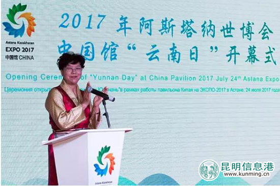 昆明信息港讯 当地时间7月24日上午,2017年阿斯塔纳世博会中国馆“云南活动日”拉开帷幕。云南省人大常委会副主任王树芬,中国国际商会秘书长于健龙,中国驻哈萨克斯坦共和国大使张汉晖,哈萨克斯坦阿斯塔那市副市长别克托尔洛娃,哈萨克斯坦国家企业家委员会副主席多斯科诺夫,哈萨克斯坦投资合作署署长艾登,云南省人大财经委员会主任王长勇,云南省政府参事、中国国际贸易促进委员会云南省分会名誉会长熊清华,云南省旅发委副主任马迎春,中国国际贸易促进委员会云南省分会副巡视员姚云祥等出席开幕式。哈萨克斯坦能源、旅游、农业等相关部门、部分外国馆的代表等近120名中外领导和嘉宾应邀出席开幕式。中国国际贸易促进委员会云南省分会会长刘光溪主持了开幕式。