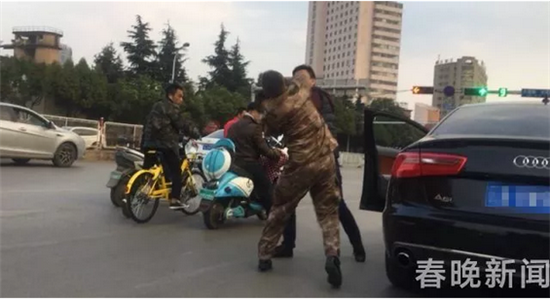 但被奥迪车司机抬起右手挡了一下,奥迪车司机还向刚好路过的电动车上的人说了一句“看到没,是他先骂人、先动手的。”