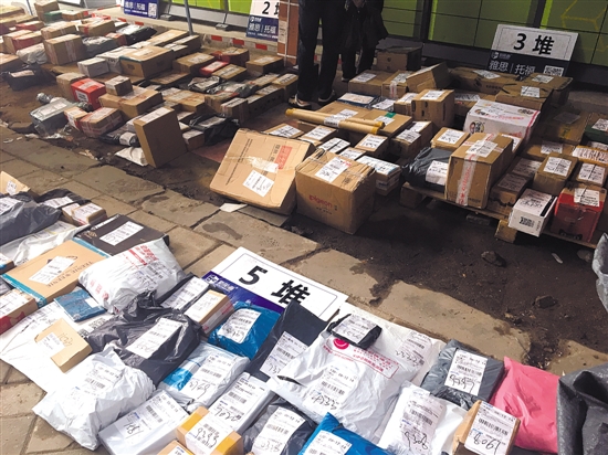 华南理工大学的快递网点地上铺满了包裹。(羊城晚报记者 宋昀潇 摄)