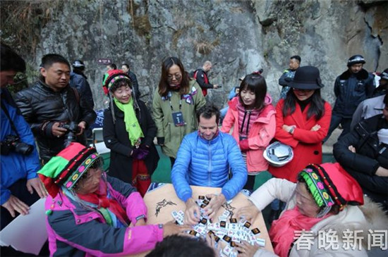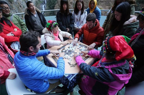 人们通常把双方有谋略的对战称作博弈,麻将即是一种古老的博弈游戏。12月17日上午9点,中国•大理漾濞石门关首届国际麻将挑战赛在石门关景区高空玻璃栈道平台拉开了序幕,来自大理漾濞彝族的四位麻将天后对阵远道而来的4位国外雀神,打响雀圣守护之役。