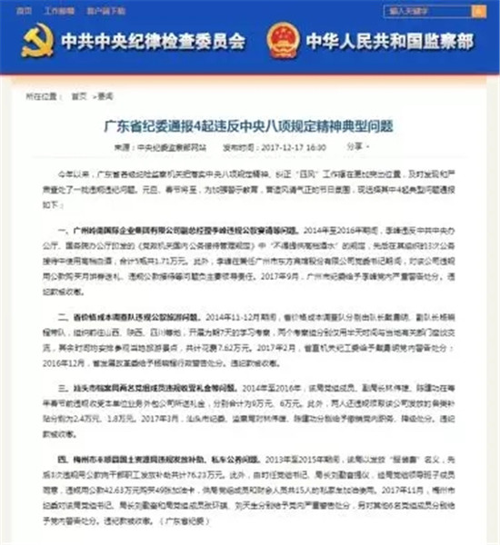 广东省纪委通报4起违反中央八项规定精神典型问题