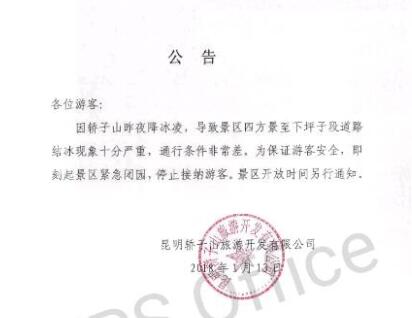 昆明信息港讯 记者段佳琪 1月13日,记者从轿子山旅游开发有限公司获悉,因昨夜(1月12日)降冰凌,导致轿子雪山四方景至下坪子段道路结冰现象十分严重,通行条件很差。为保证游客安全,即刻起景区紧急闭园,停止接纳游客。
