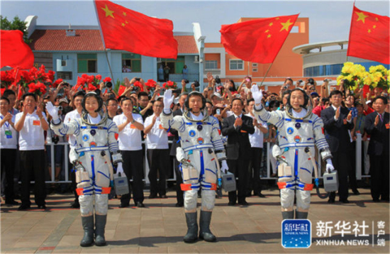 2012年6月16日,神舟九号航天员出征仪式在酒泉卫星发射中心航天员公寓问天阁举行,航天员景海鹏、刘旺、刘洋(从右至左)向欢送人群挥手致意。新华社记者 李刚 摄