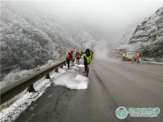 昆明信息港讯 1月27日至2月2日,昭通持续低温雨雪冰冻天气,大部区域最低气温降至0℃以下,到处白雪皑皑,一幅冰天雪地的景象,公路结冰严重,对公路通行及春运工作造成不利影响。昭通路政支队全员动员,积极投入到抗冰保通工作中,确保春运道路安全畅通。
