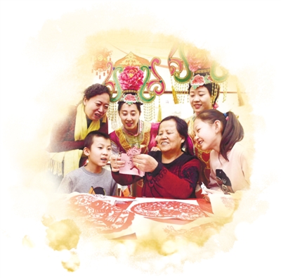 2月2日,呼和浩特满族文化博物馆,民间艺人项灵芝(右三)为游客传授满族民间剪纸技艺。王 正摄