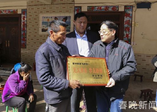 “杨高飞是我们学校的好学生,他走得很英勇很光荣,是我们学校的骄傲,也是你们的骄傲。我们今天来看他和你们来了,希望你们振作起来,好好地生活下去……”说完,罗爱国向杨高飞的父亲杨得富递上5万元慰问金:“这是我们全校师生的一点心意,请你收下吧,我们祝杨高飞一路走好!”