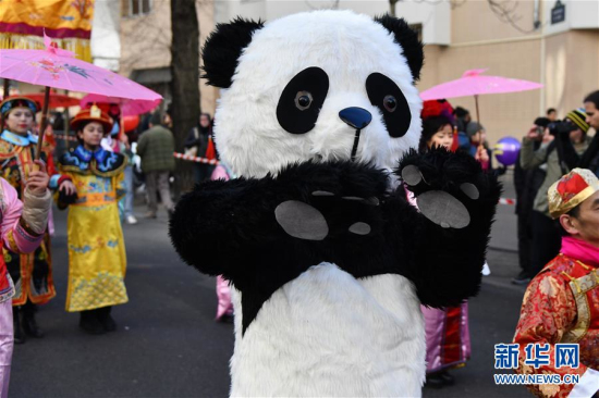2月25日,在法国巴黎,大熊猫造型人偶参加春节彩妆大游行。