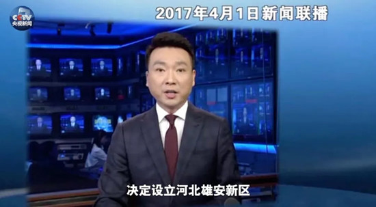2017年4月1日《新闻联播》:日前,党中央国务院印发通知,决定设立河北雄安新区。这是继深圳经济特区和上海浦东新区之后又一具有全国意义的新区,是千年大计、国家大事。