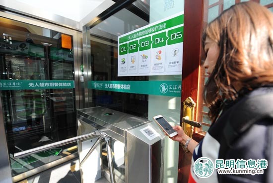 昨日,记者来到昆明故城三江并流无人超市厨餐体验店。在超市入口处的闸机上显眼处,就看到一个二维码,只需通过微信扫一扫就能打开闸机进入超市。超市内主要为顾客提供牛肉、蔬菜、面食、饮品等数十种新鲜食材,当顾客选购好所有商品,到达结账感应区域时,结账设备会自动读取每件商品价格、数量等相关数据,生成物品账单。顾客只需要通过微信支付之后,闸口自动打开,全程无须服务人员干预。