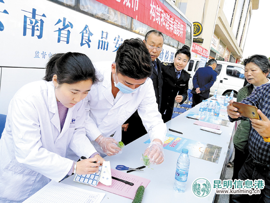 昆明信息港讯(昆明日报 记者徐婕) 为不断提高群众对昆明市食品安全的满意度以及市民对创建国家食品安全示范城市工作的参与度和获得感,充分发挥社会公众的参与和监督作用,昨日,3·15食品安全“你点我检”活动在云纺举办。市民拿着蔬菜、水果前来免费检测,现场就能得知蔬果是否有农药残留。