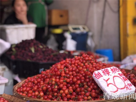 樱桃,是非常美味且营养价值较高的水果之一,外表色泽鲜艳,晶莹美丽,红如玛瑙,黄如凝脂,果实富含糖、蛋白质、维生素及钙、铁、磷、钾等多种元素。在篆新农贸市场内,已有少部分摊位开始售卖早熟的小樱桃,价格根据品相的不同在60~70元/公斤不等。