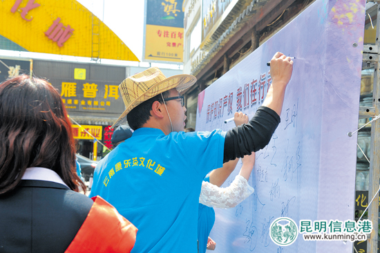 昆明信息港讯(昆明日报 记者李丹丹) 昨日下午,2018年云南省“4·26”版权宣传周主会场专题活动在云南财经大学北院汇文礼堂启动。近千名财大学子和在昆高校的部分学生纷纷来到活动现场,在巨幅主题展板上庄重签下自己的名字,立誓保护创作,保护知识产权。