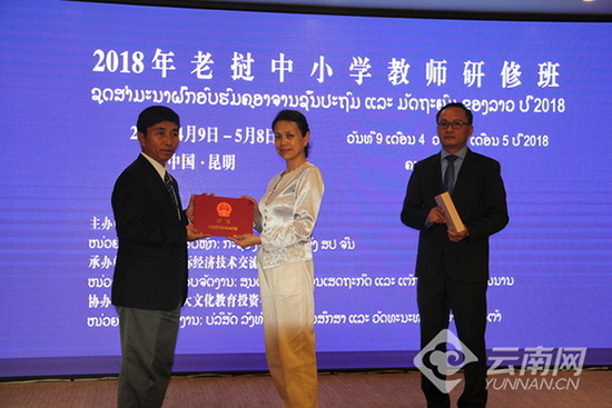 5月8日,2018年老挝中小学教师研修班结业典礼在昆明举行。典礼现场,到场嘉宾与研修班教师一同观看了本次研修班纪念短片。老挝人民民主共和国驻昆明总领事馆坎蓬•冯桑迪总领事、云南省商务厅巡视员黄姗为研修班教师颁发了结业证书。