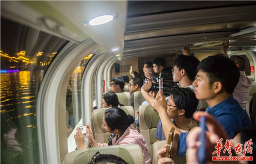 5月13日晚,“美丽中国长江行——共舞长江经济带·生态篇”湖南站媒体团登船夜游穿紫河。唐俊 傅聪 摄