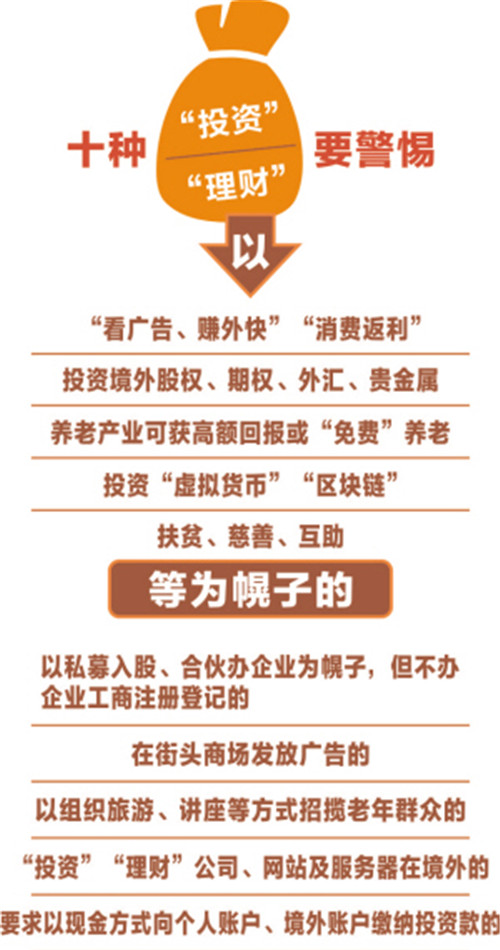 针对新型网络传销、非法集资等突出经济犯罪案件高发多发、社会关注度高的情况,省公安厅提醒广大群众,要切实增强风险意识,警惕以“看广告、赚外快”“消费返利”等为幌子的;以投资境外股权、期权、外汇、贵金属等为幌子的;以养老产业可获高额回报或“免费”养老为幌子的;以私募入股、合伙办企业为幌子,但不办企业工商注册登记的;以投资“虚拟货币”“区块链”等为幌子的;以扶贫、慈善、互助等为幌子的;在街头商场发放广告的;以组织旅游、讲座等方式招揽老年群众的;“投资”“理财”公司、网站及服务器在境外的;要求以现金方式向个人账户、境外账户缴纳投资款的10种“投资”“理财”项目。