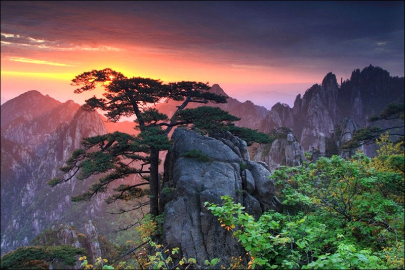 【点睛】当东方泛起鱼肚白,巍峨的高山众星拱月般的托出一轮光芒四射的红日,在奇松群峰间穿梭。若是此刻有云海相依相伴,日出美景则更为壮丽,整个黄山都沉浸在云蒸霞蔚的艳丽光彩之中。
