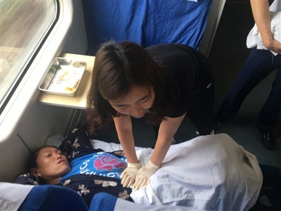 “大家搭把手,先把孕妇抬到空旷的车厢去,赶紧广播找医生;准备好热水,准备好急救箱,通知餐车主任给孕妇准备点红糖荷包蛋……”在现场,列车长袁庆向车上的其他工作人员有序安排工作。