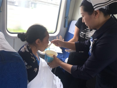 列车的餐车主任把红糖荷包蛋端了过来,给虚弱的产妇喂食