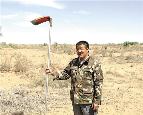 王银吉手持自己发明的治沙工具“沙木枪”。刘静怡摄