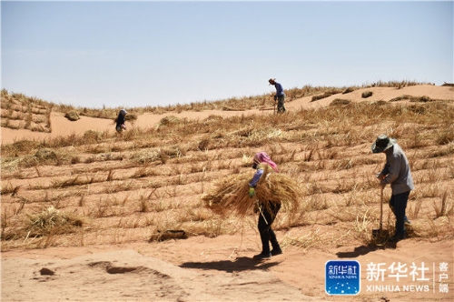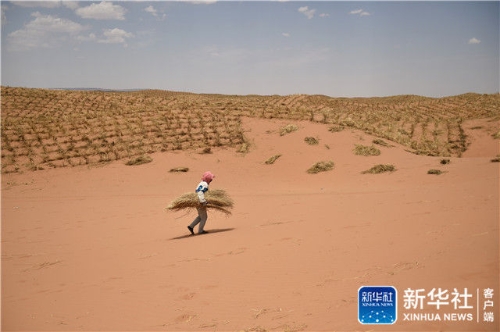 ↑一位工人抱着麦草行走在腾格里沙漠中(6月11日摄)。新华社记者 卢鹰 摄