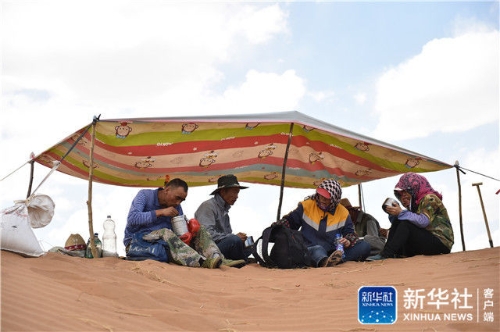 ↑扎草方格的工人们在腾格里沙漠里吃午饭(6月11日摄)。新华社记者 卢鹰 摄